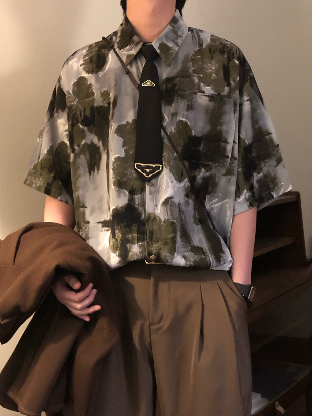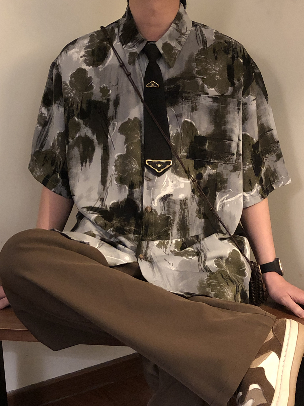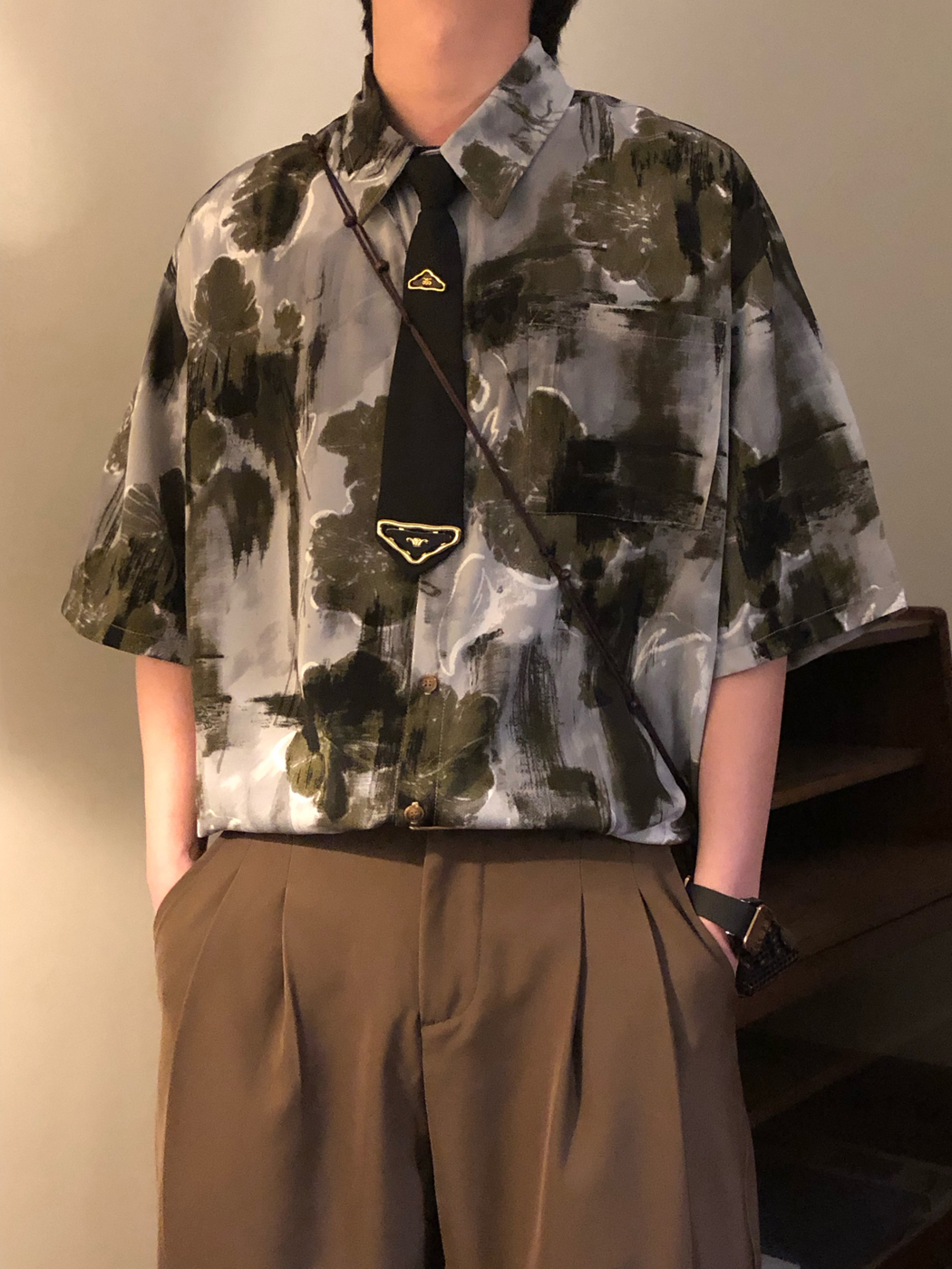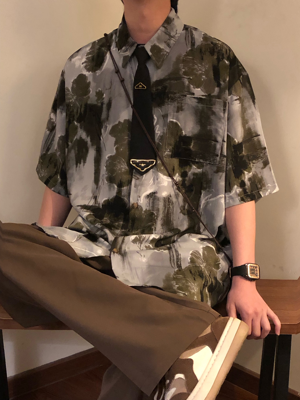 Nagawl夏季美式复古休闲水墨晕染艺术感港风短袖花衬衫上衣男女潮