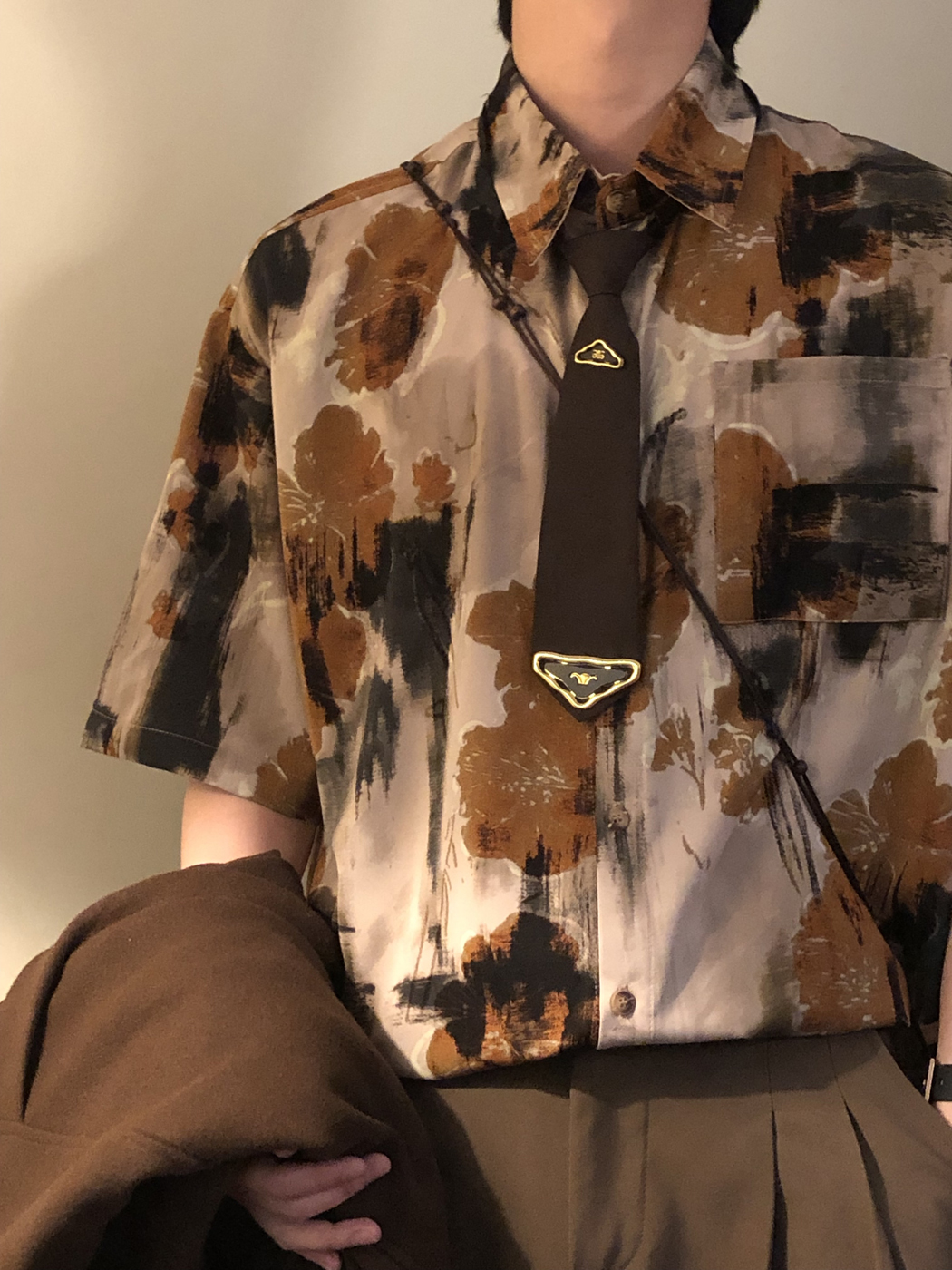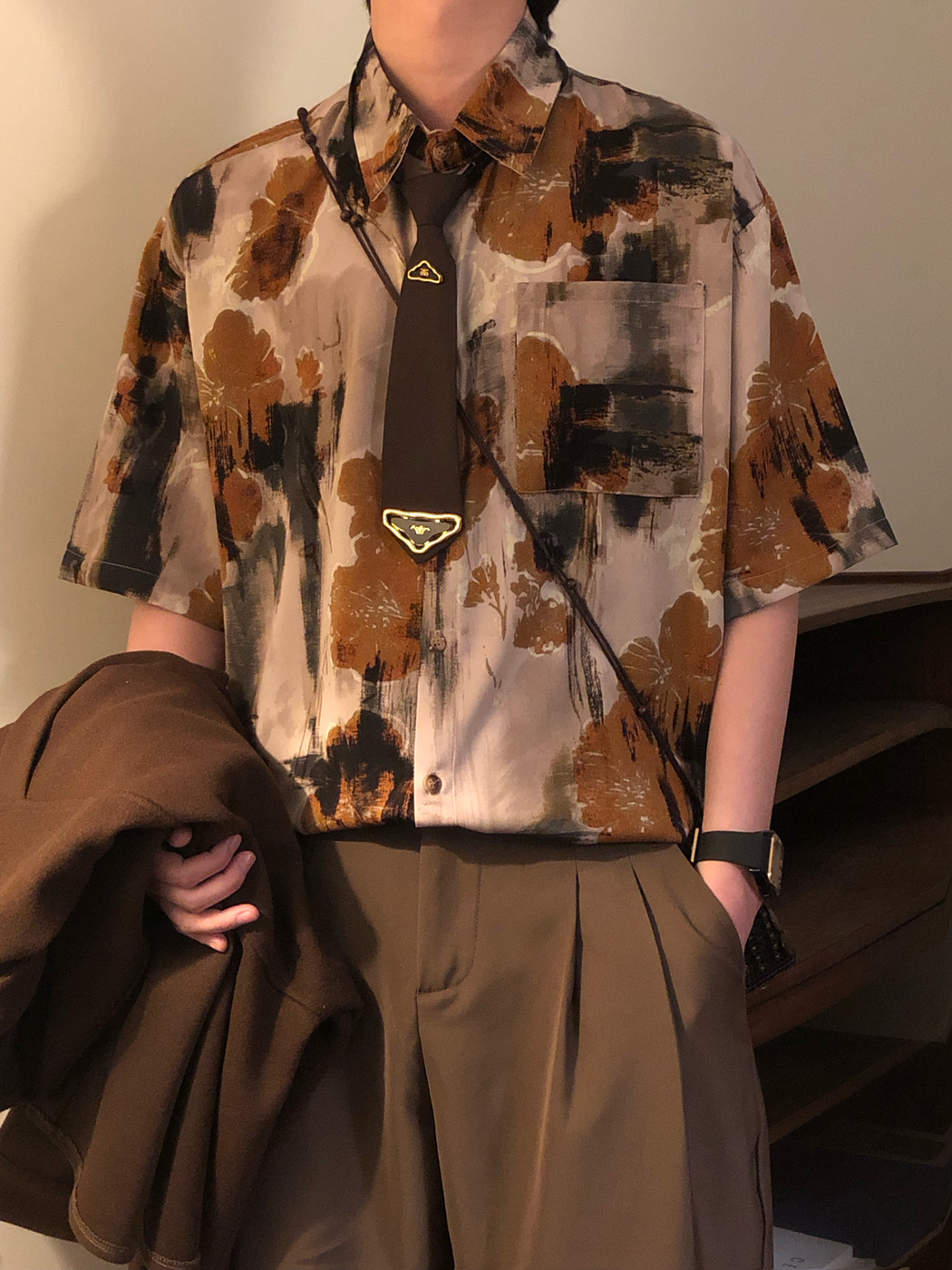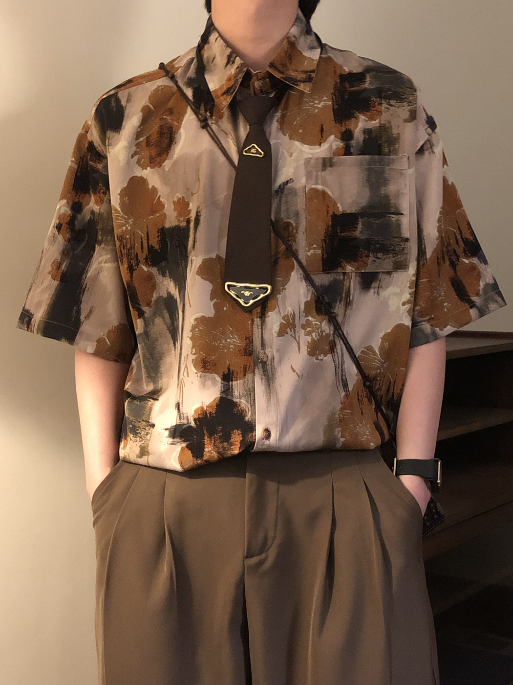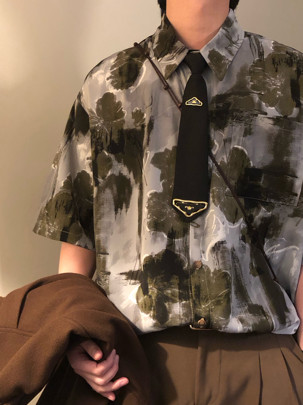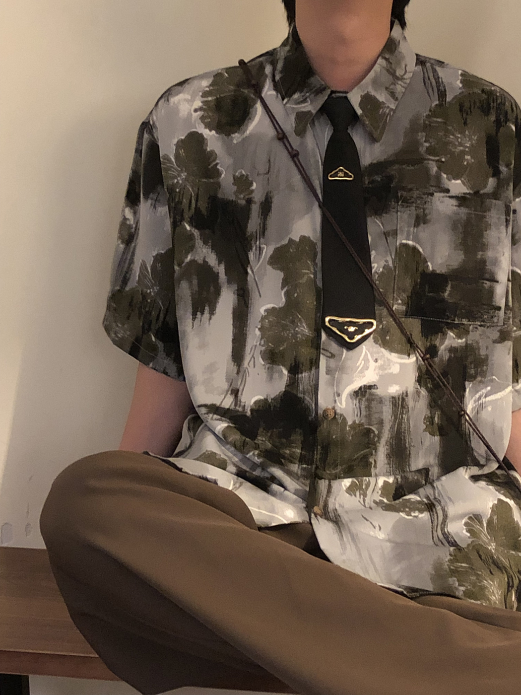 Nagawl夏季美式复古休闲水墨晕染艺术感港风短袖花衬衫上衣男女潮