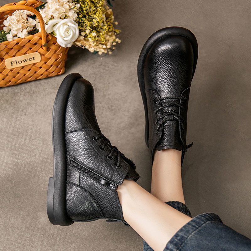 断码处理女靴秋季头层牛皮高帮女单鞋系带软底平底休闲短筒裸靴潮