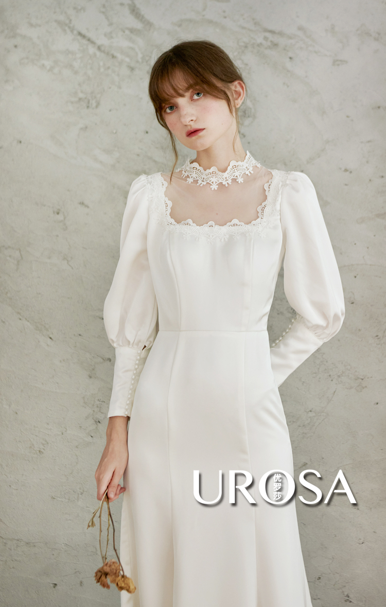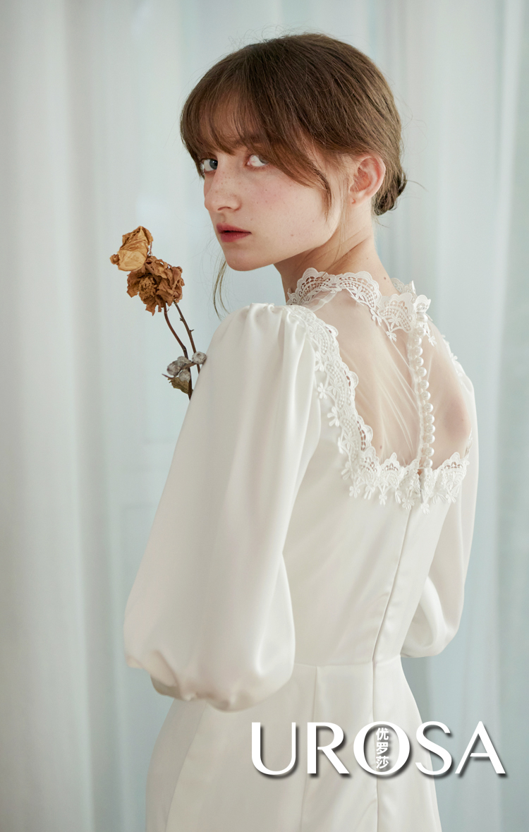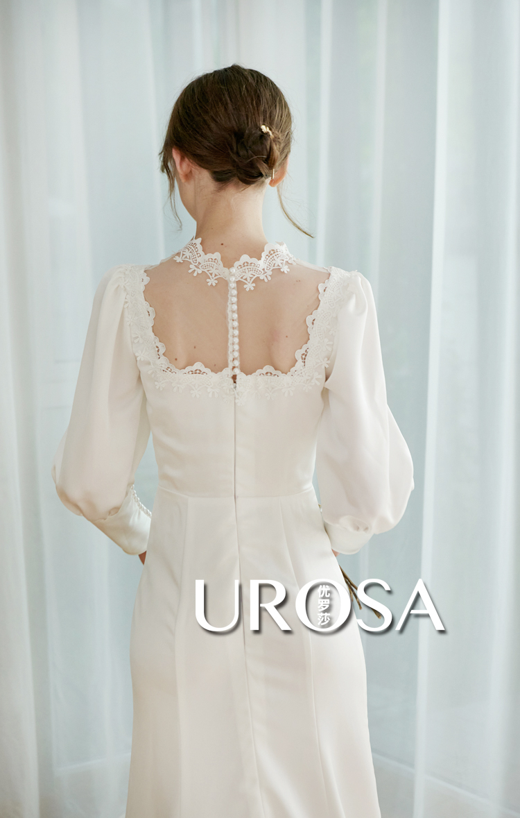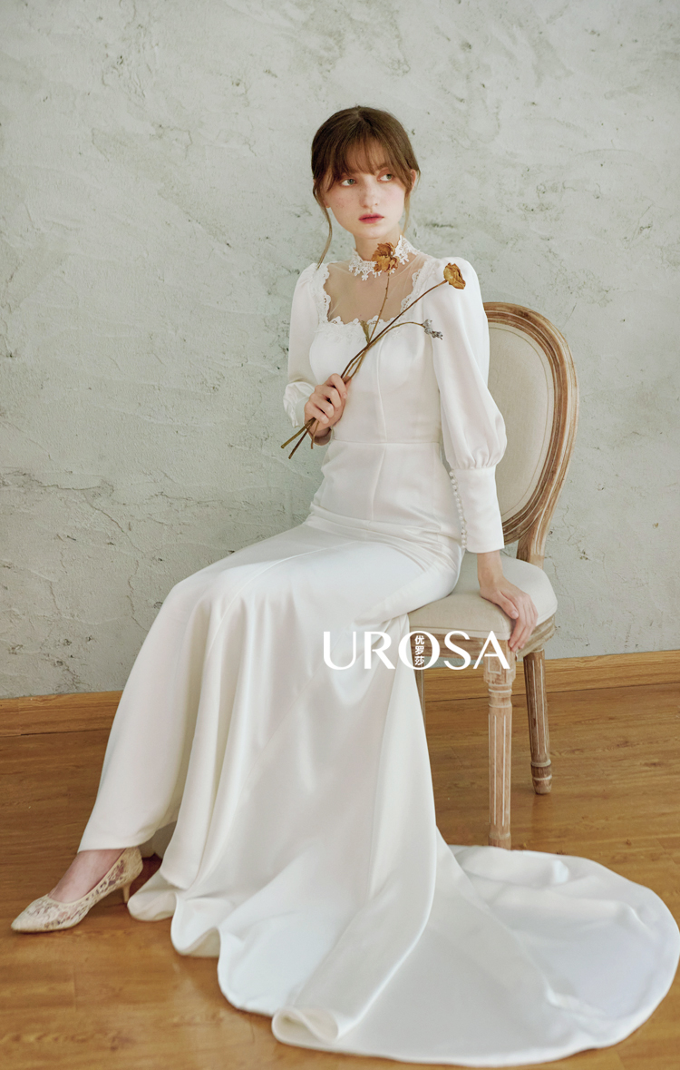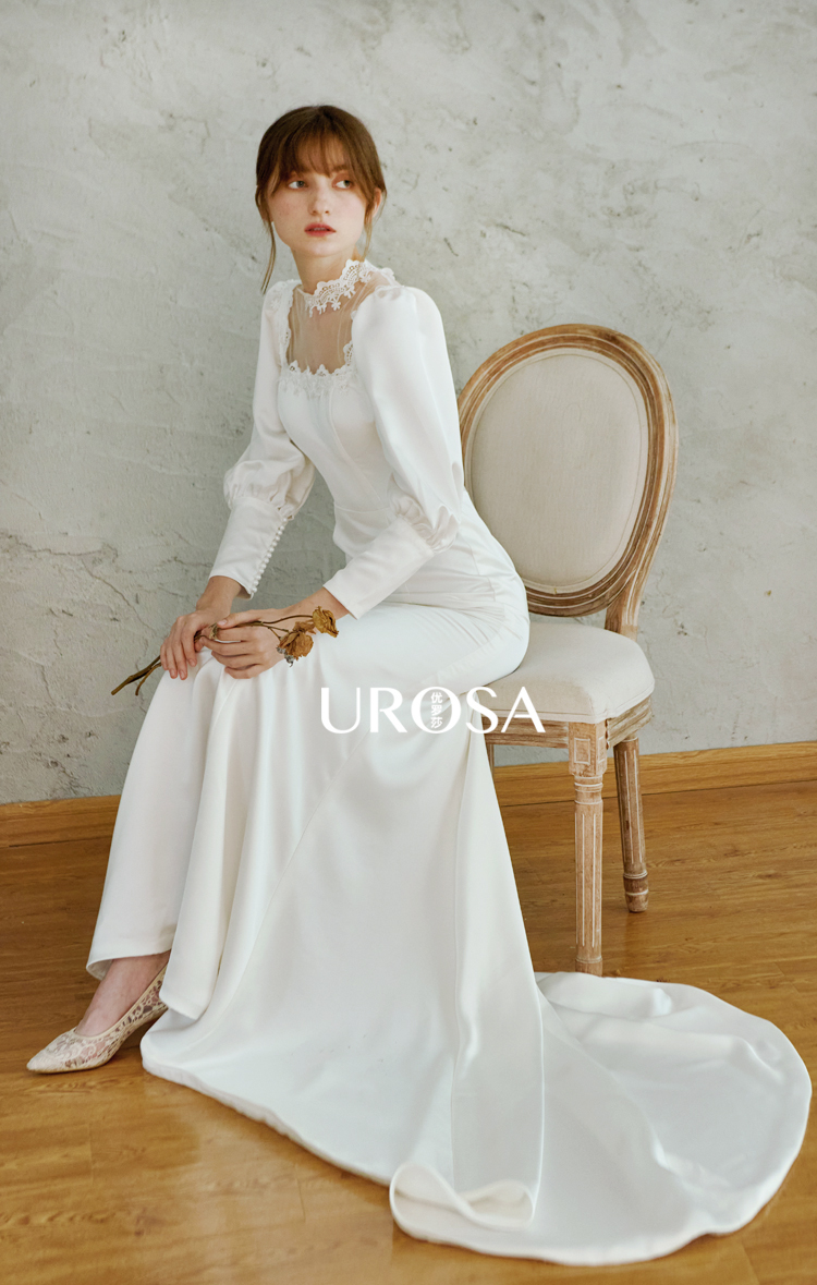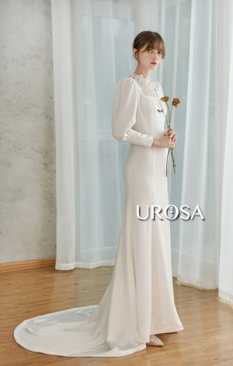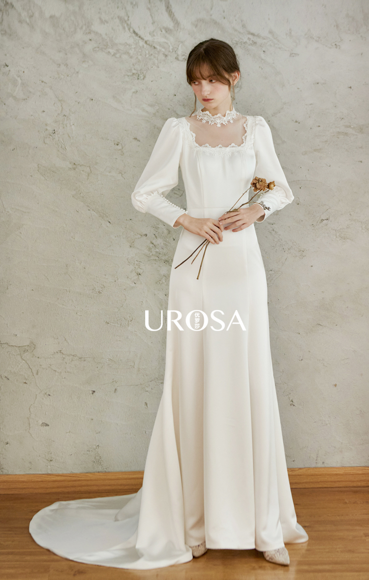 设计师原创新款复古灯笼袖绸缎新娘婚纱优雅气质鱼尾显瘦森系轻纱