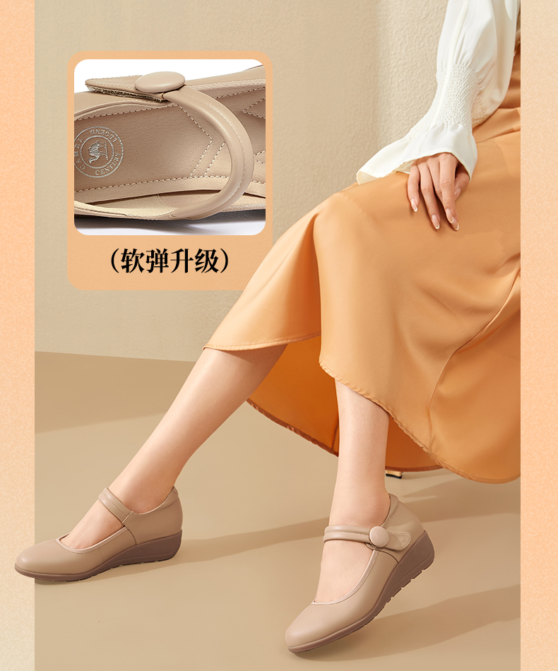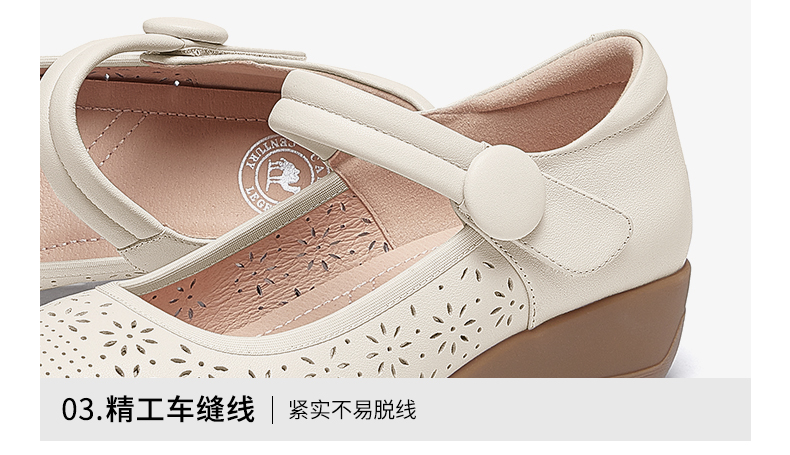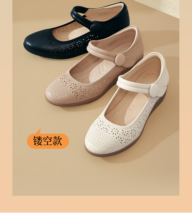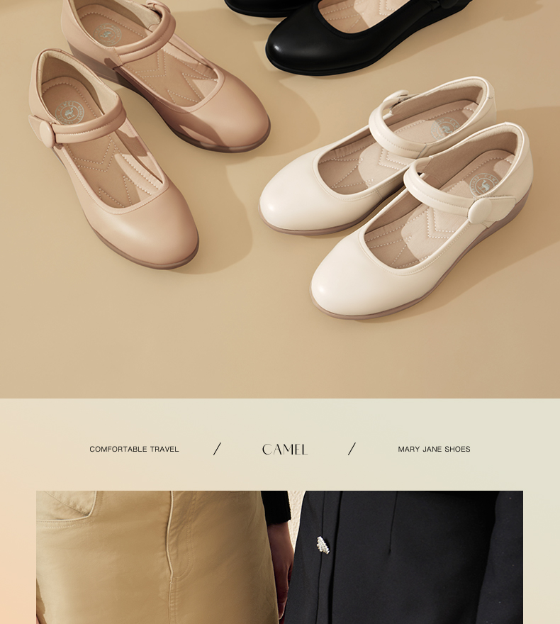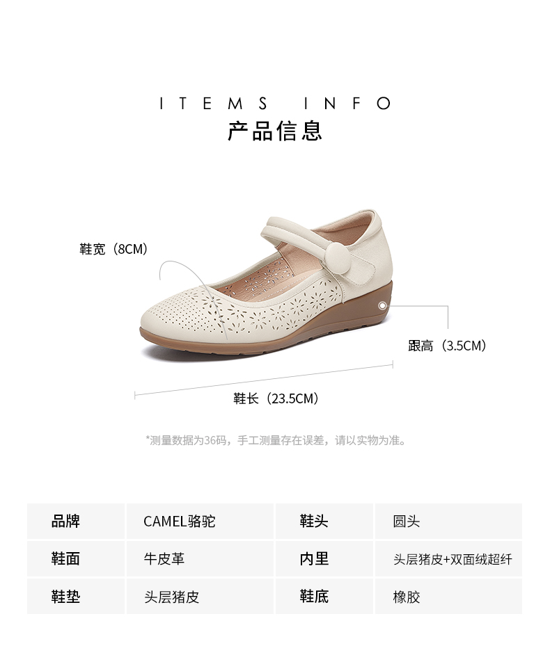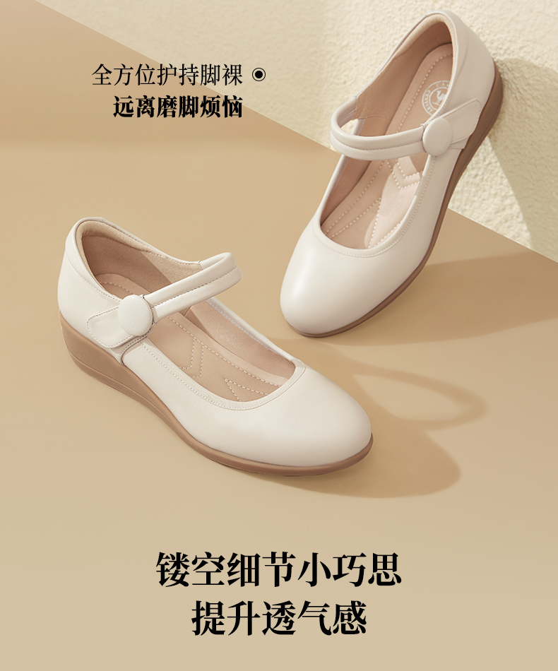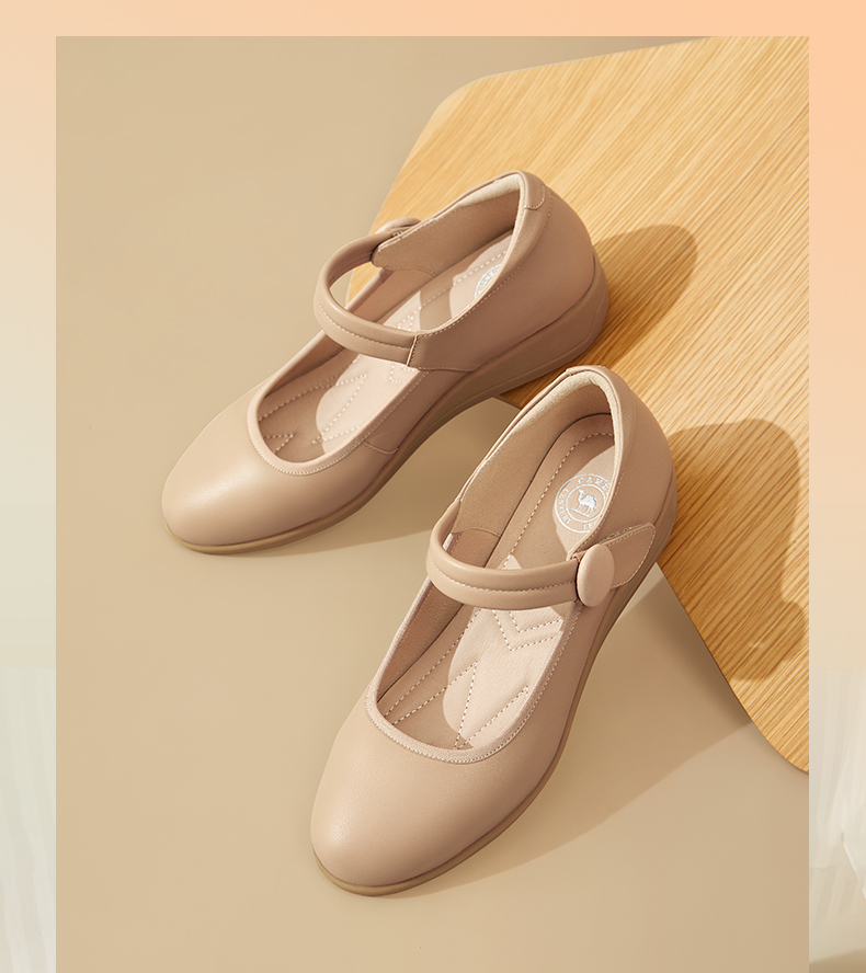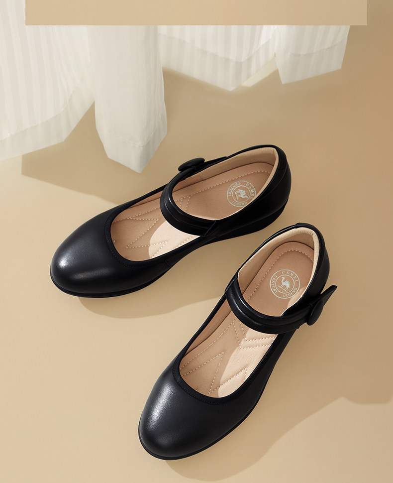 骆驼女鞋2025春秋季牛皮玛丽珍妈妈鞋坡跟镂空真皮单鞋女小皮鞋