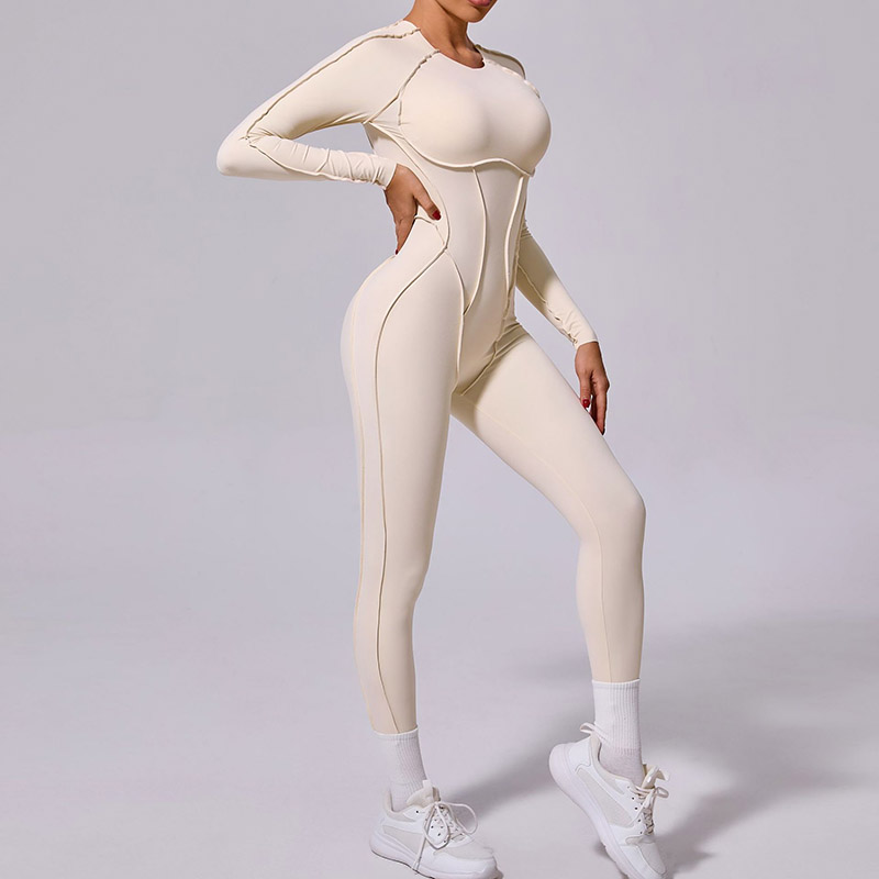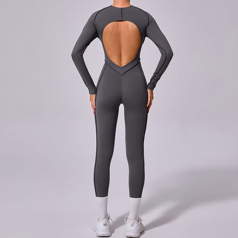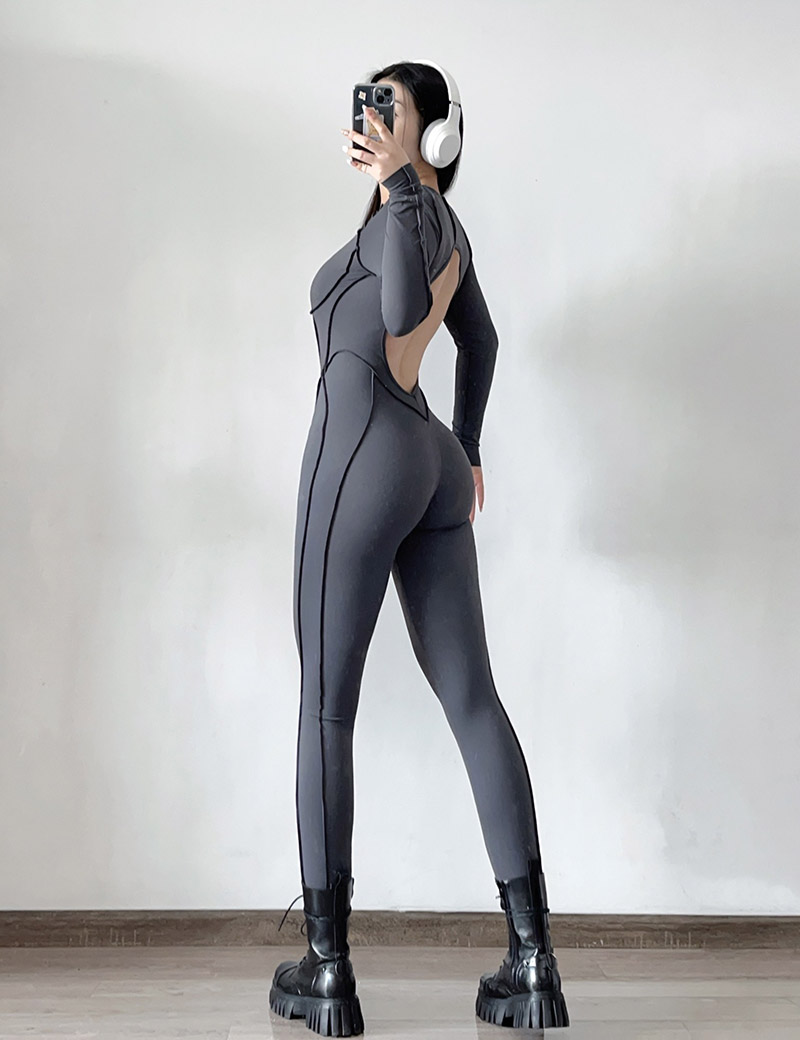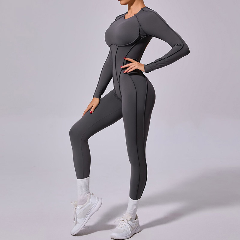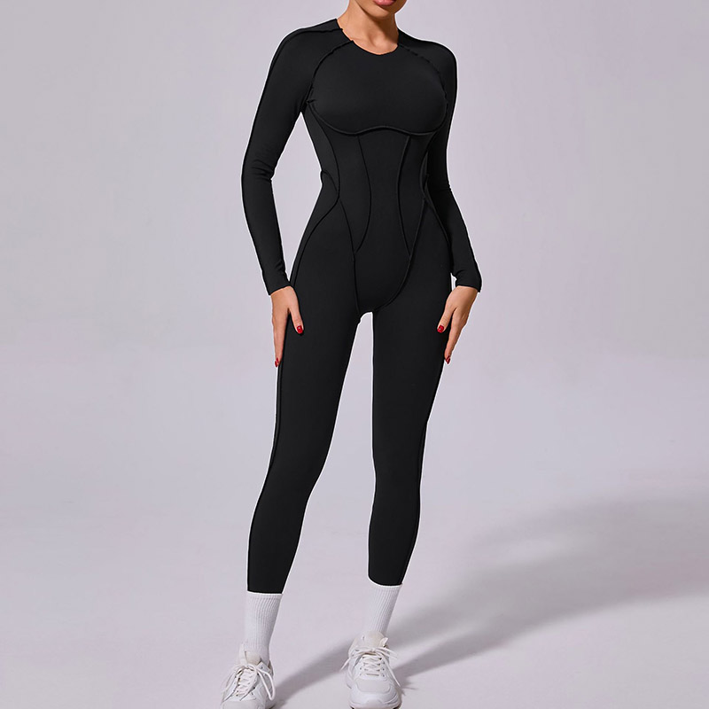 欧美立体拼缝瑜伽连体服女一体式运动露背速干长袖长裤健身连身衣