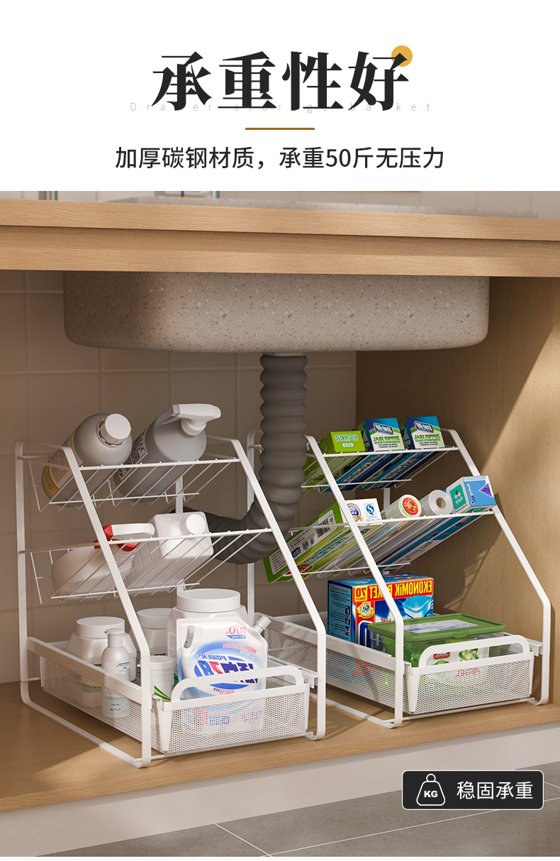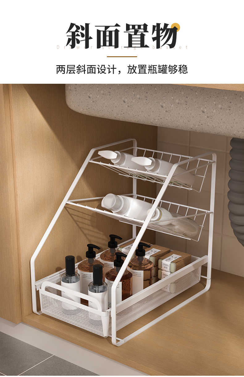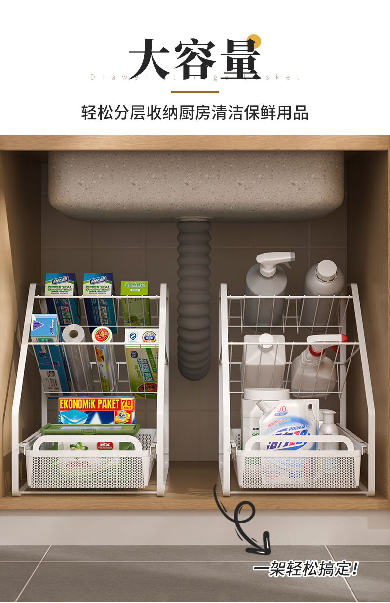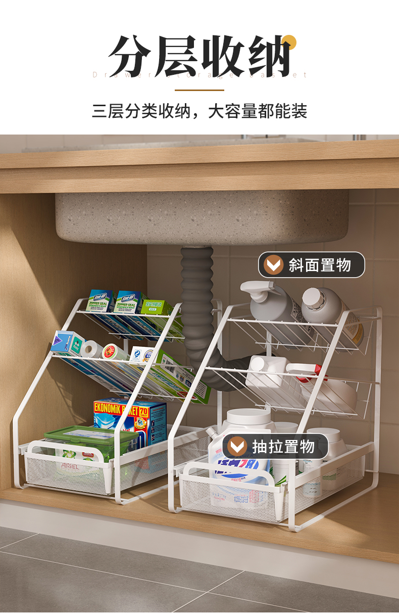 下水槽置物架抽拉式厨房橱柜分层架台面浴室密网拉篮抽屉式收纳盒