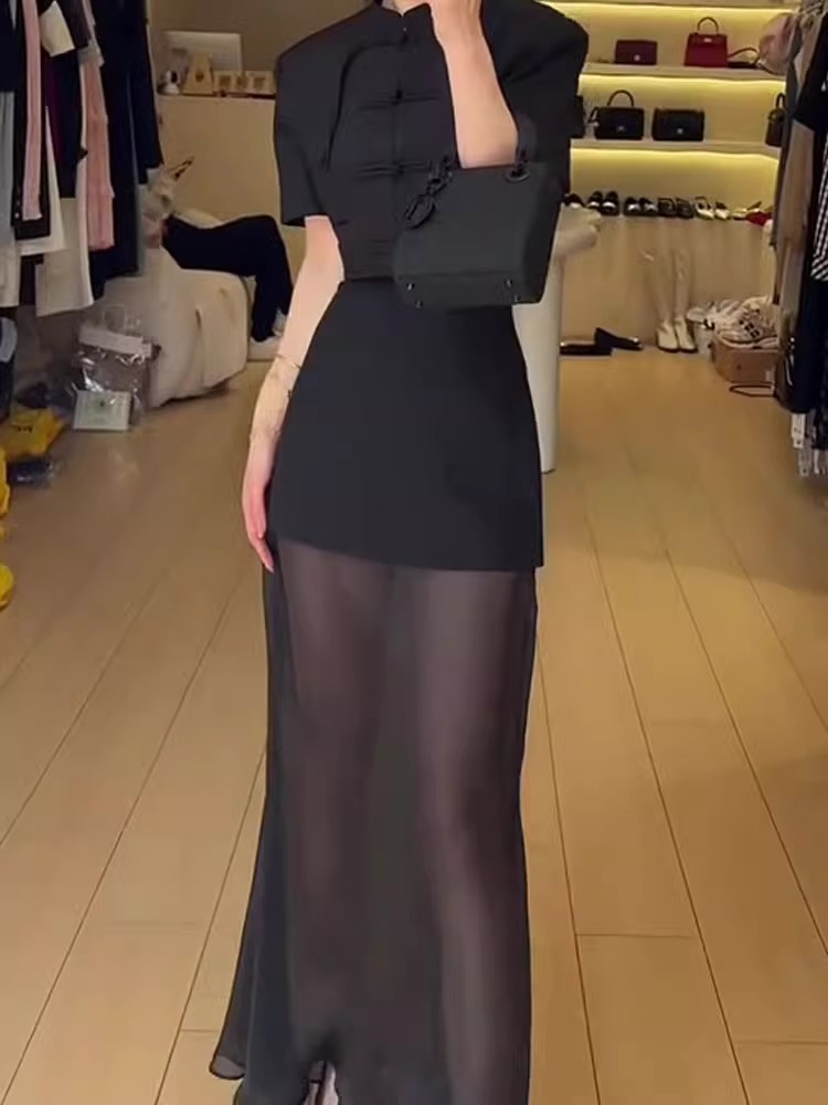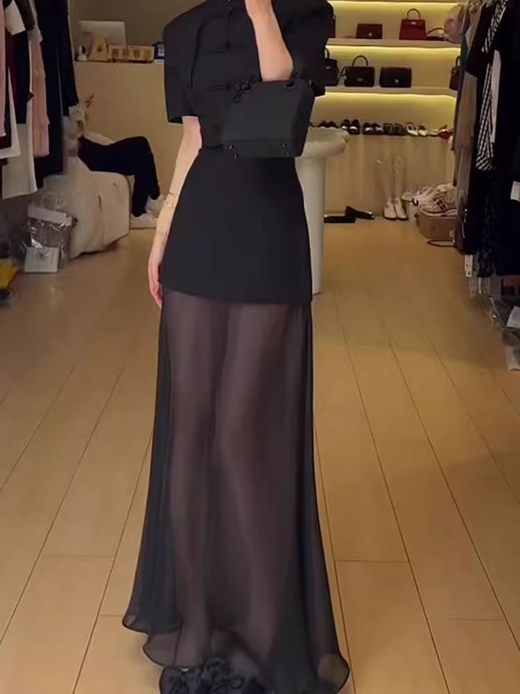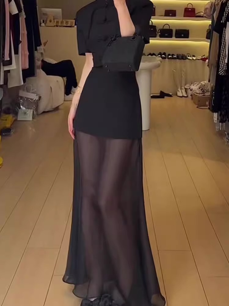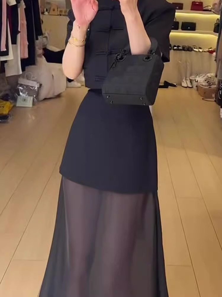 黑色拼接网纱半身裙女2025夏季新款高腰显瘦时尚气质百搭a字裙子