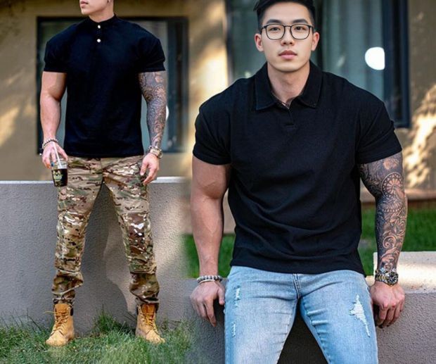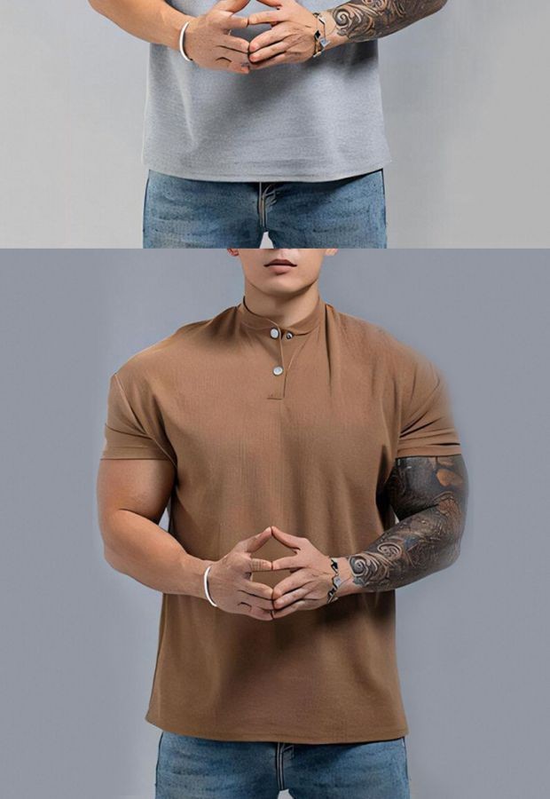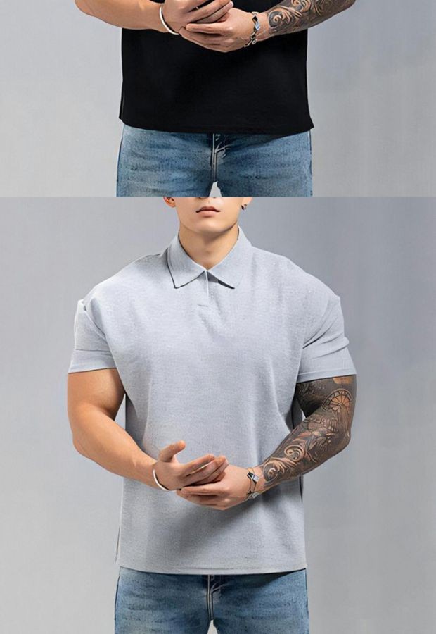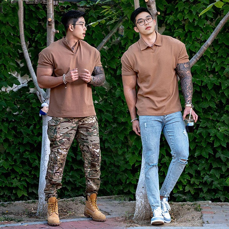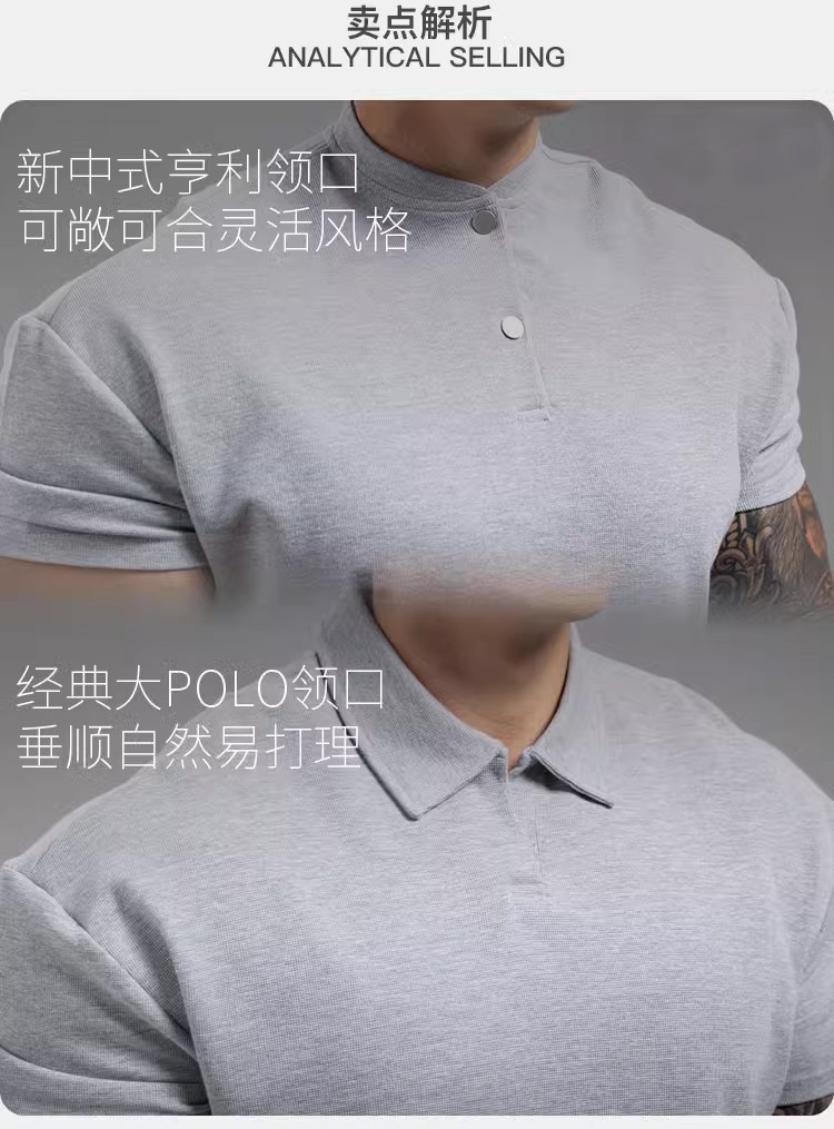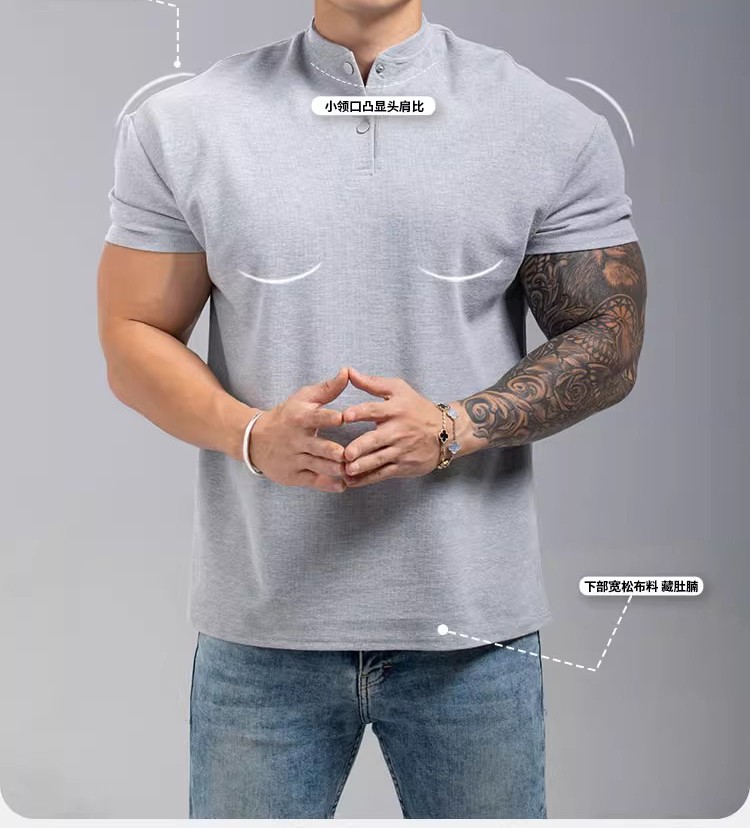 夏季收袖口健身短袖男显肌肉运动T恤POLO亨利大翻领弹力训练上衣