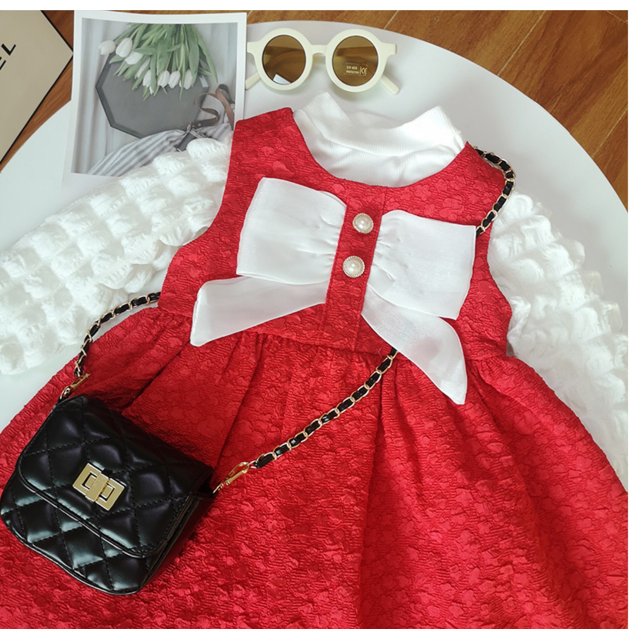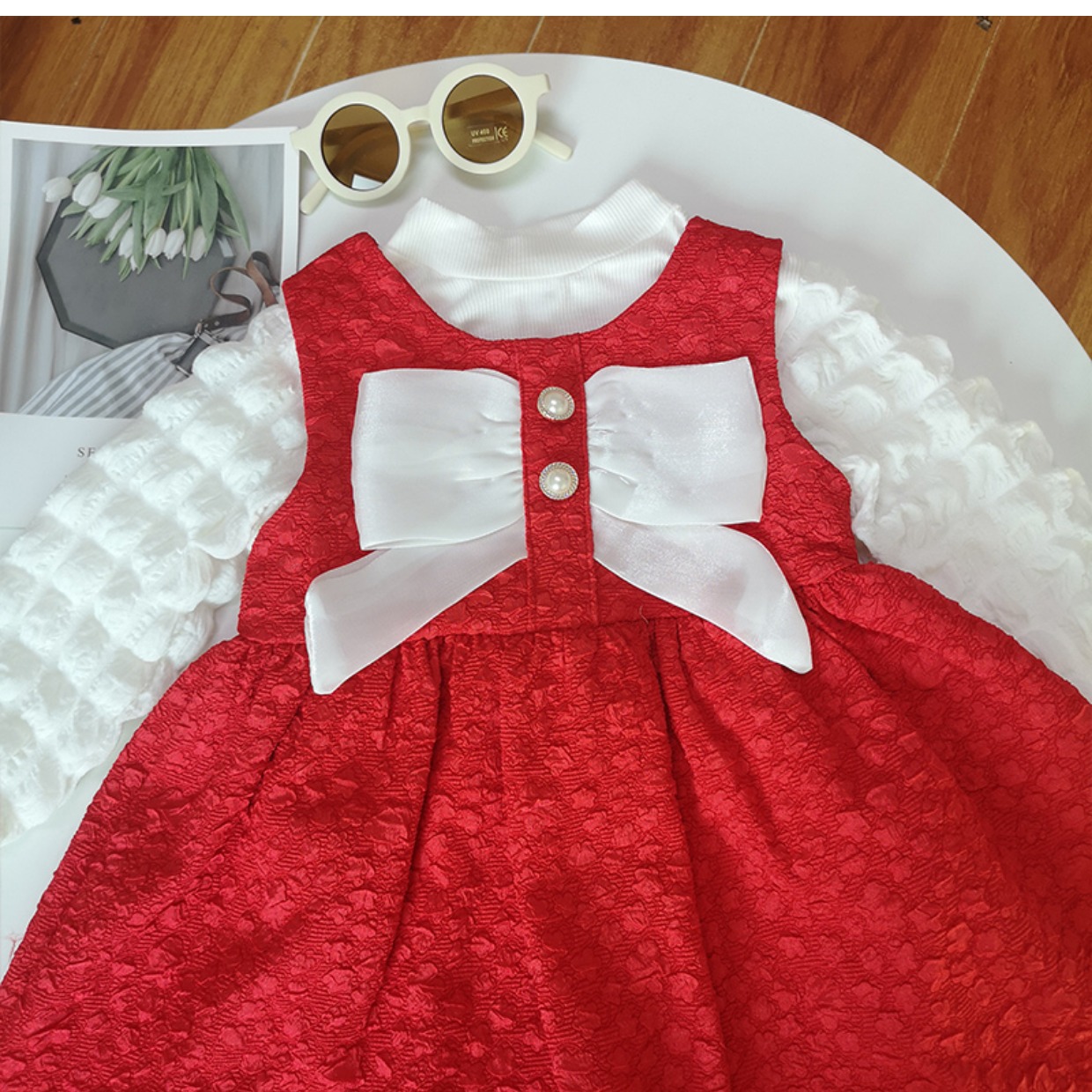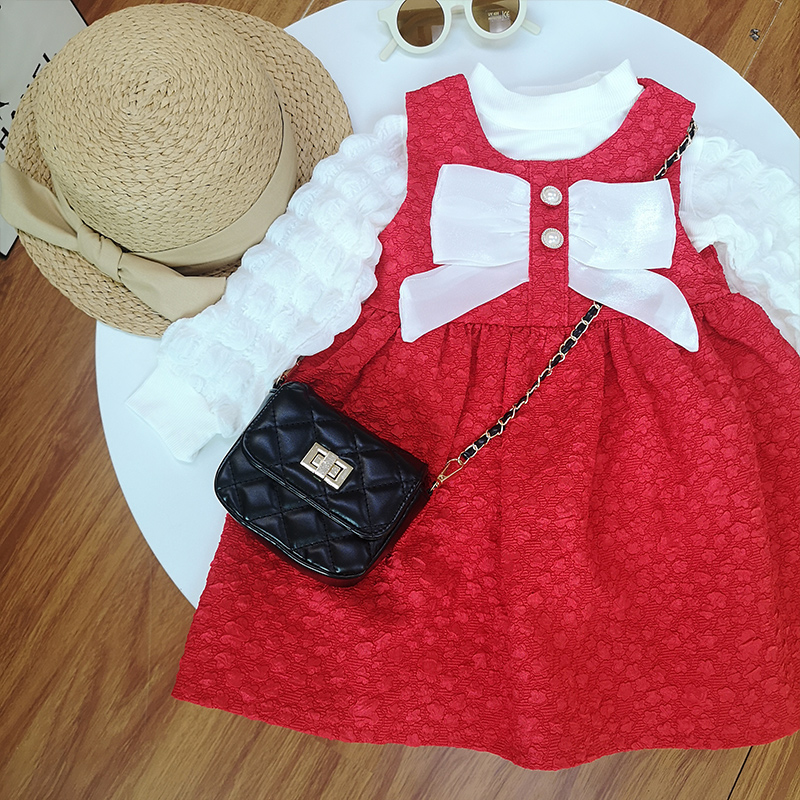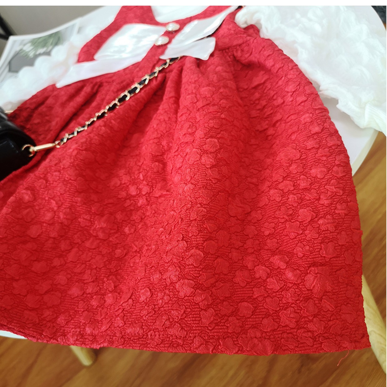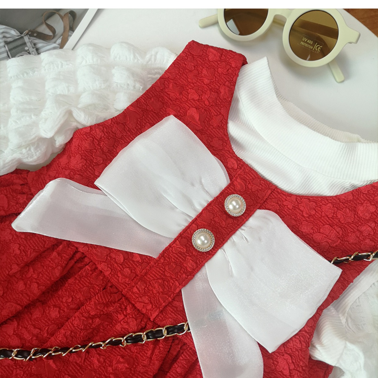 卡卡米女童连衣裙春季红色礼服裙长袖打底衫套装蝴蝶结背心裙裙子