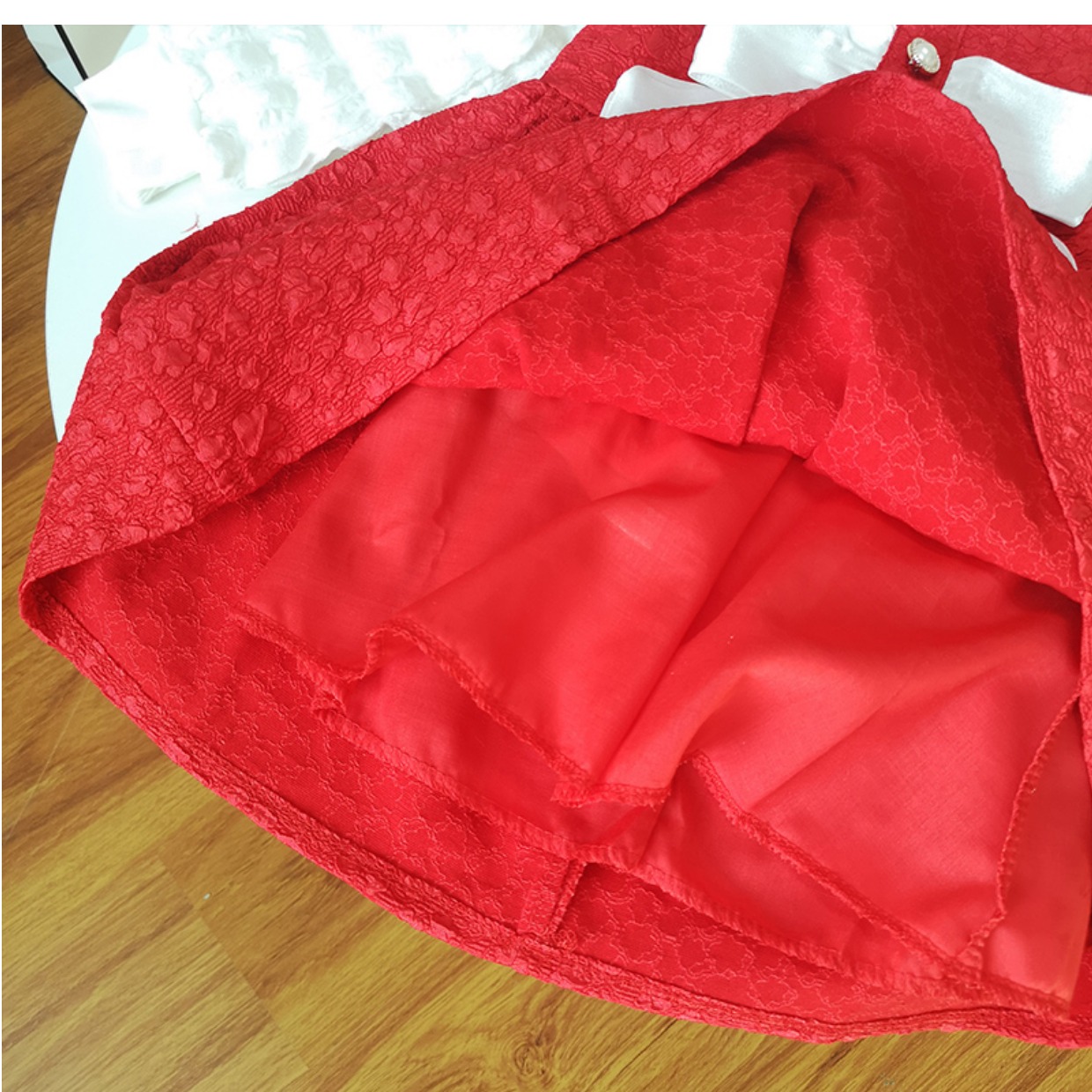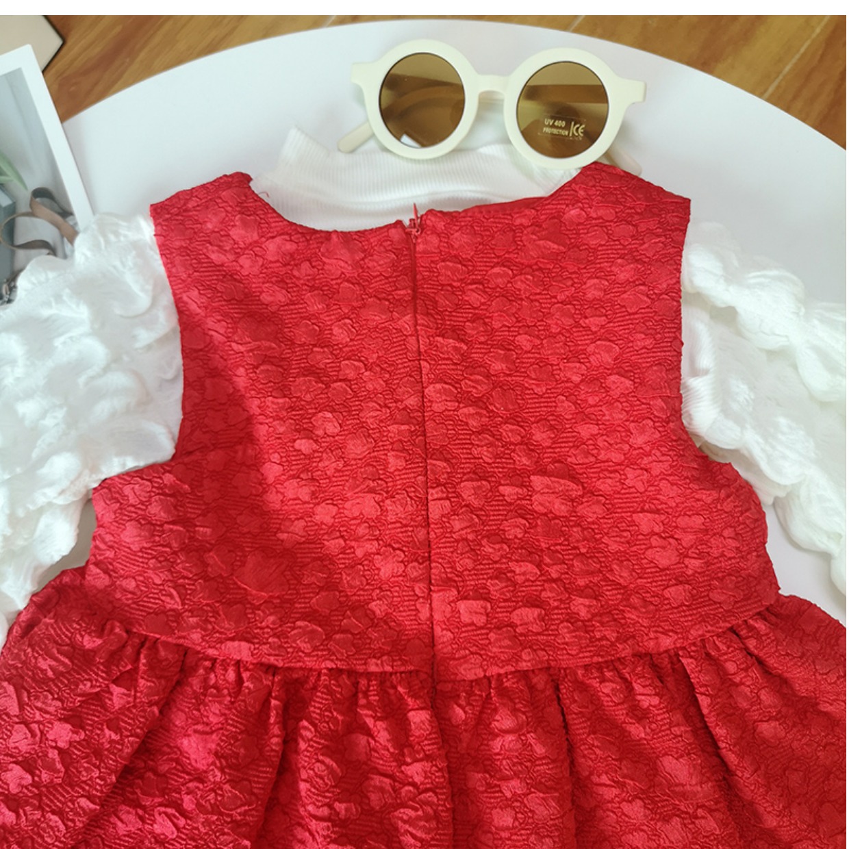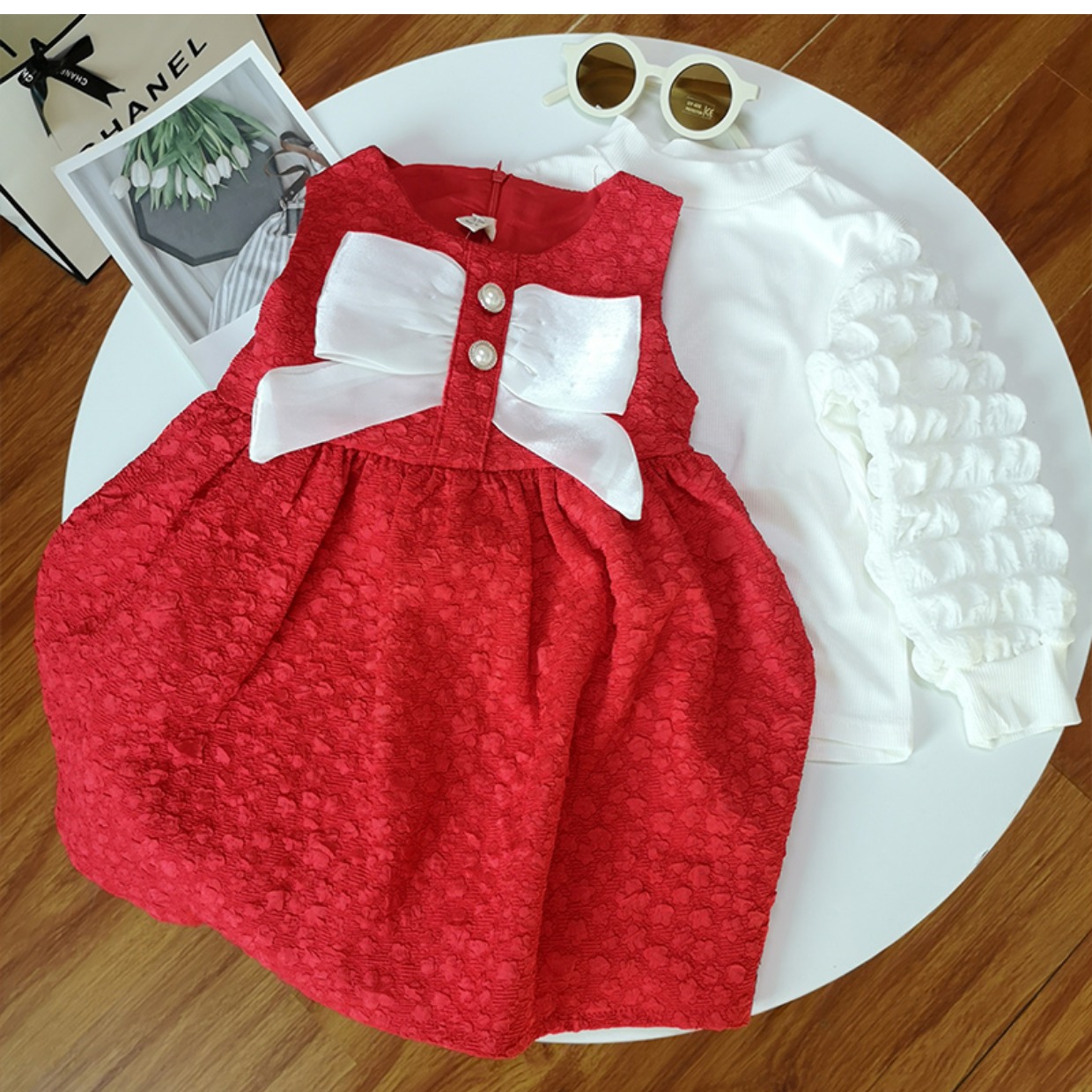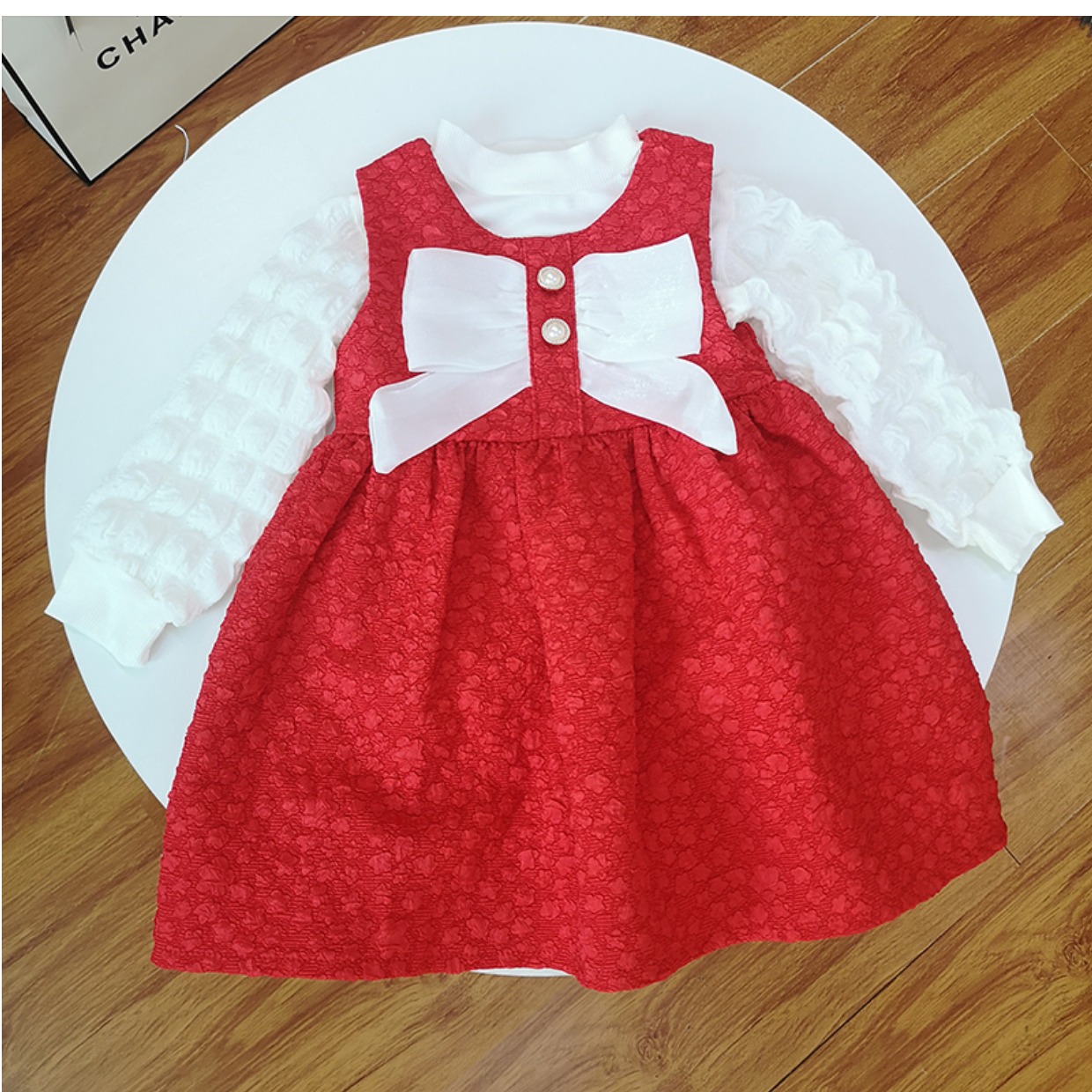 卡卡米女童连衣裙春季红色礼服裙长袖打底衫套装蝴蝶结背心裙裙子