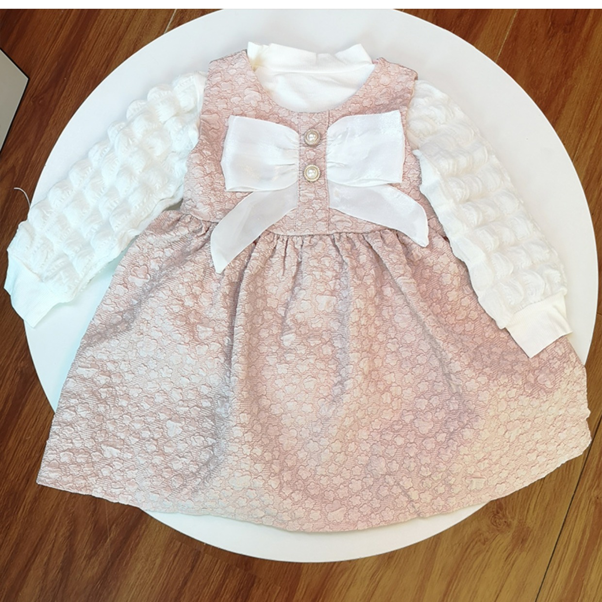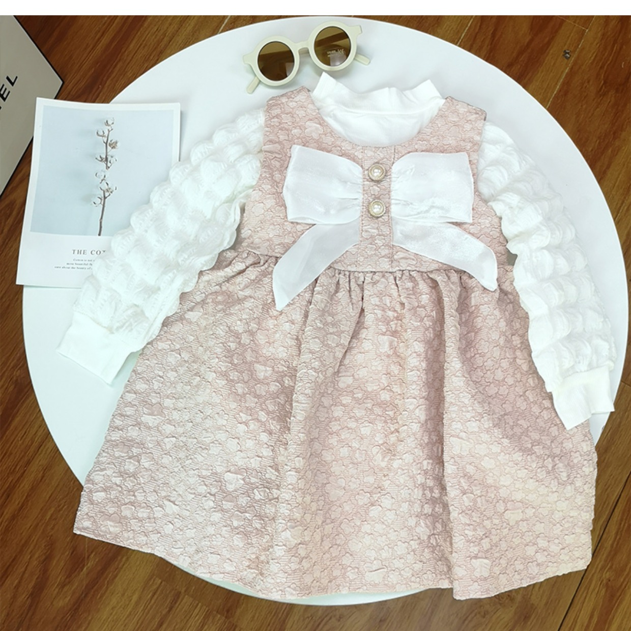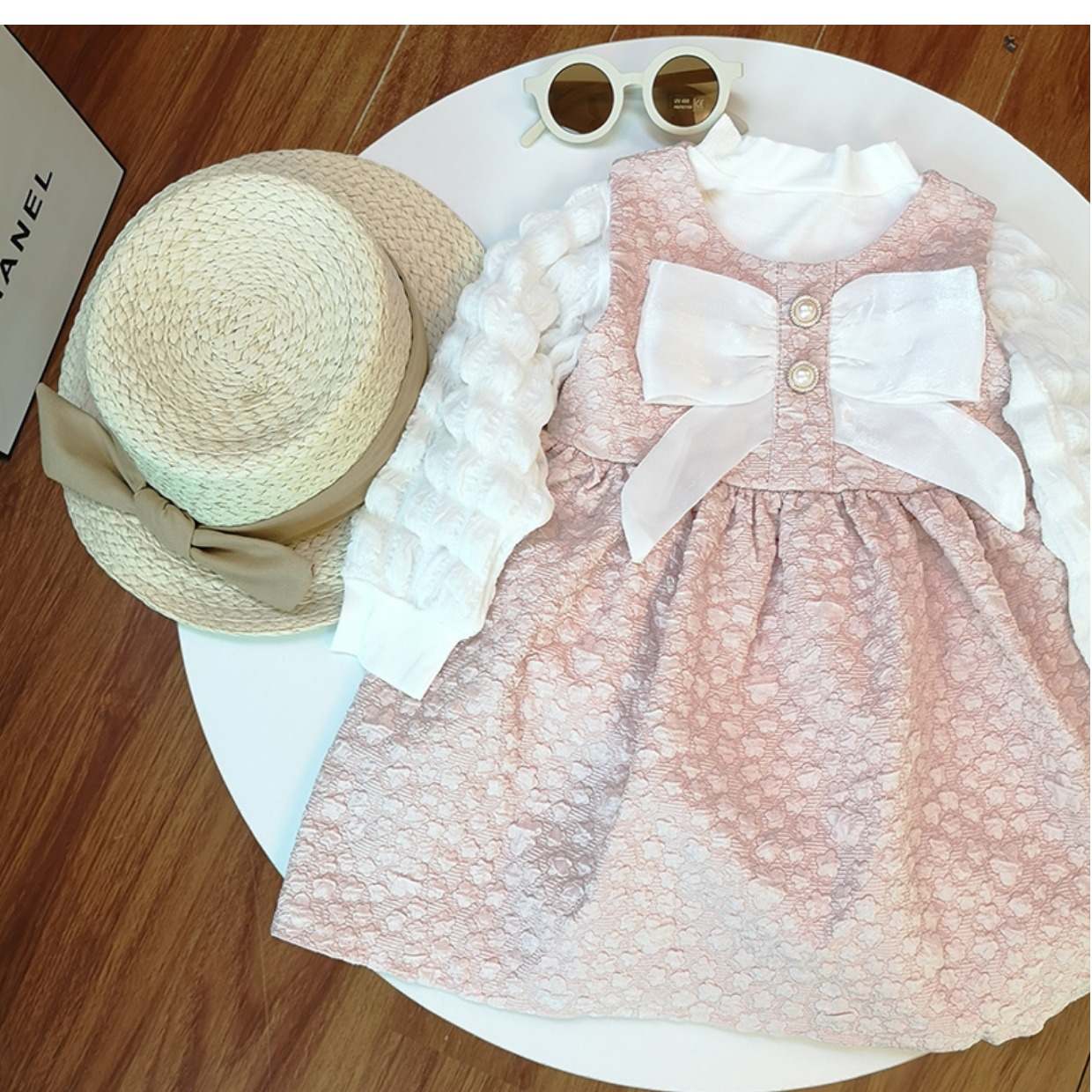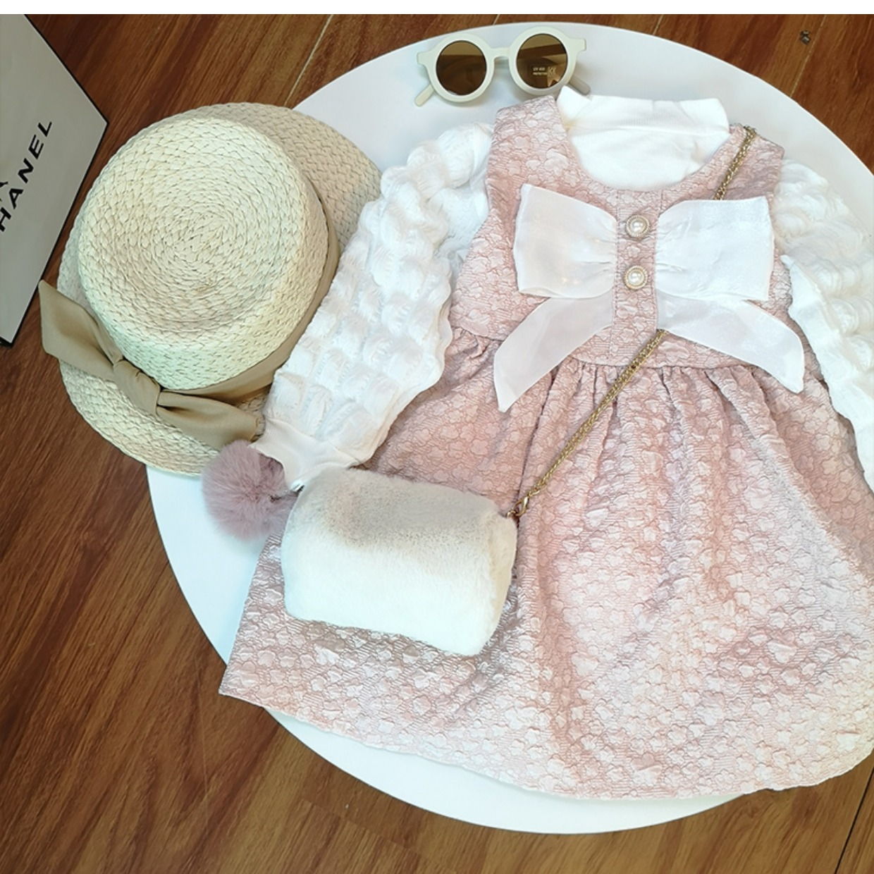 卡卡米女童连衣裙春季红色礼服裙长袖打底衫套装蝴蝶结背心裙裙子