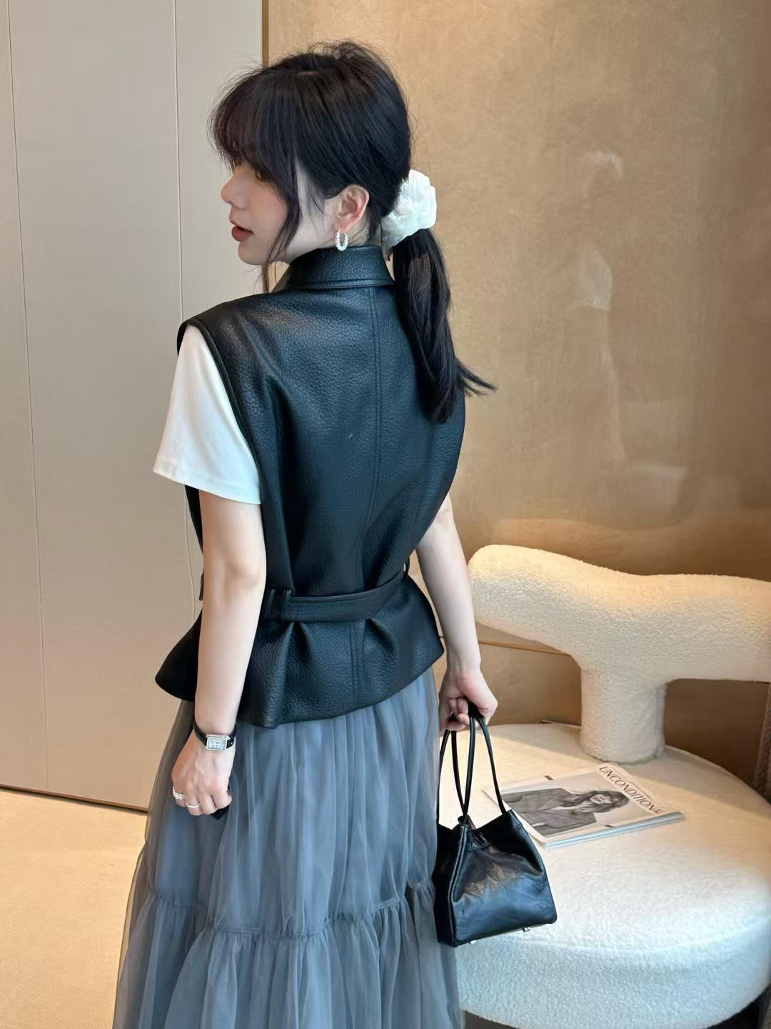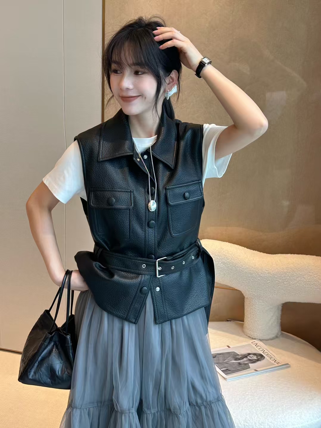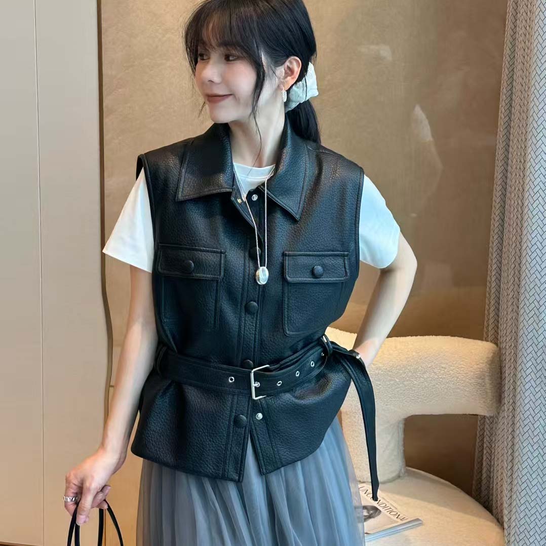 欧洲站2025春装新款欧货街头风休闲收腰系带皮衣马甲女春秋坎肩潮