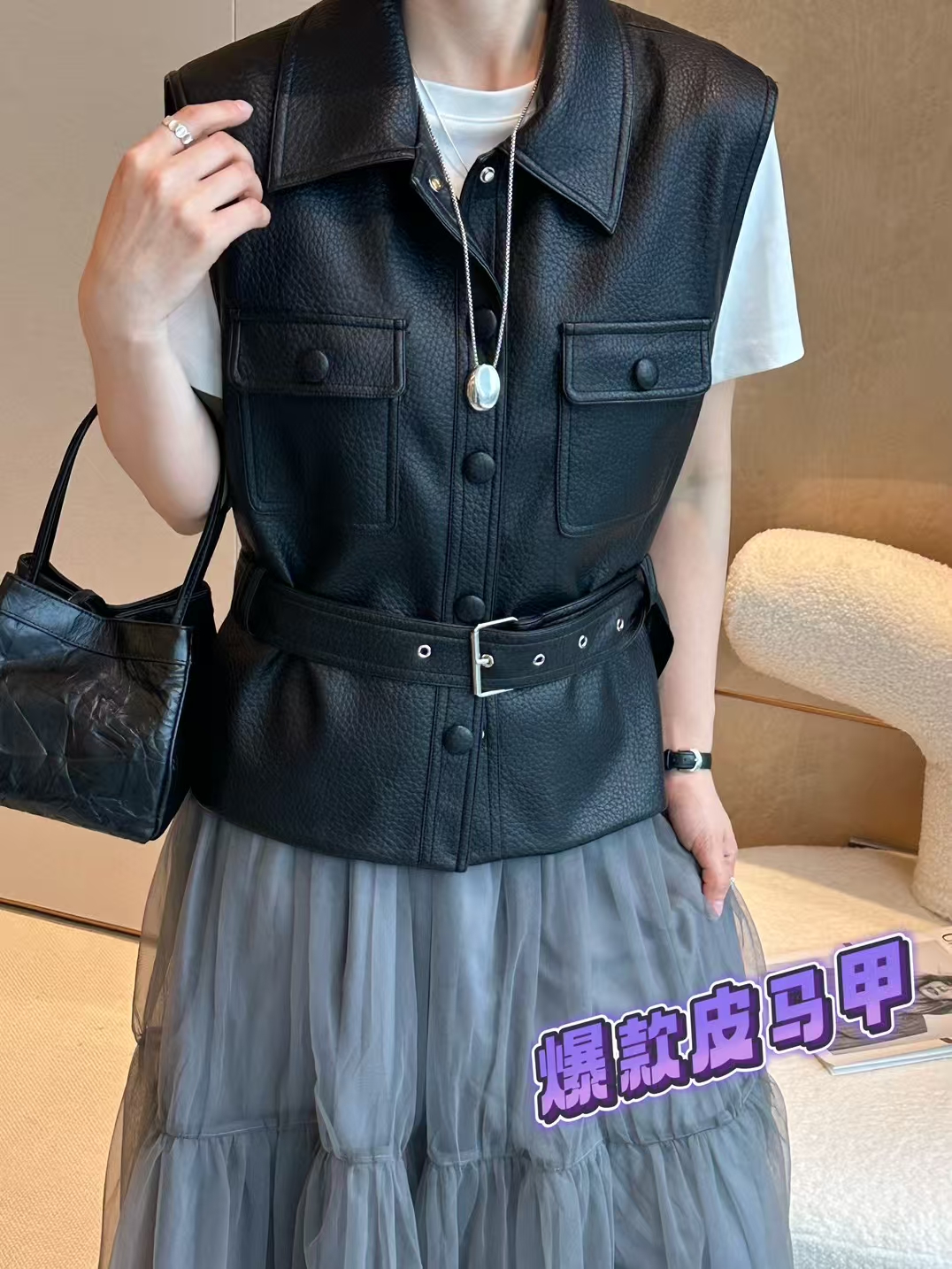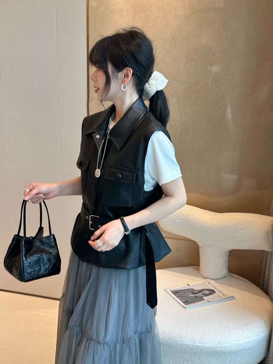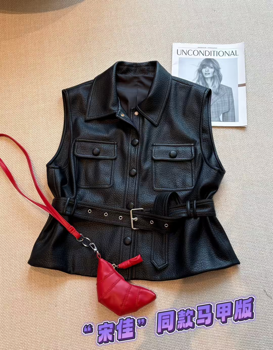 欧洲站2025春装新款欧货街头风休闲收腰系带皮衣马甲女春秋坎肩潮