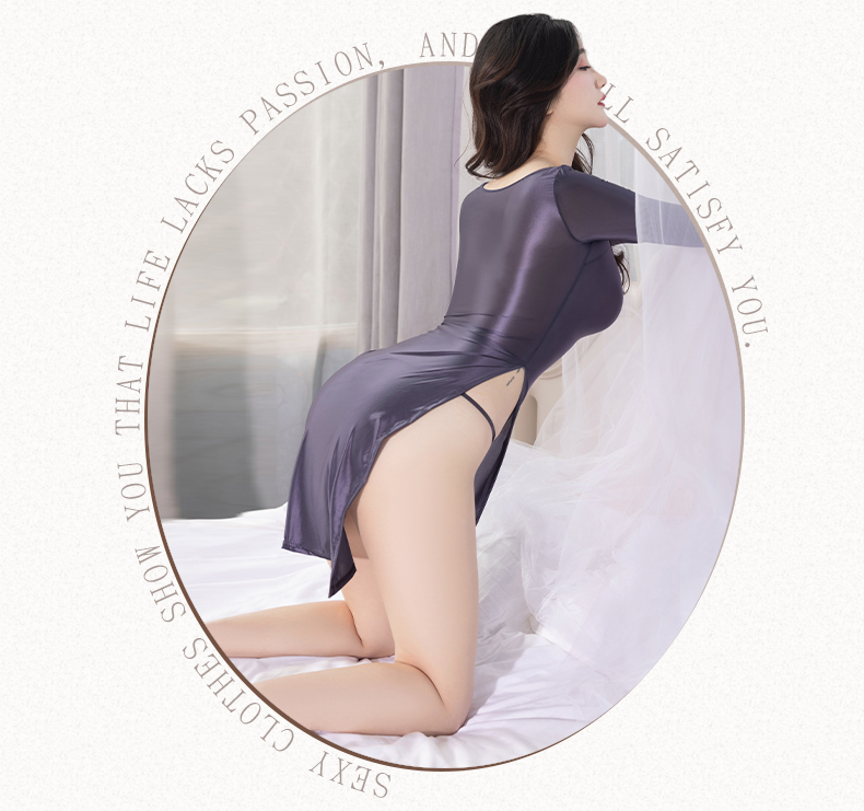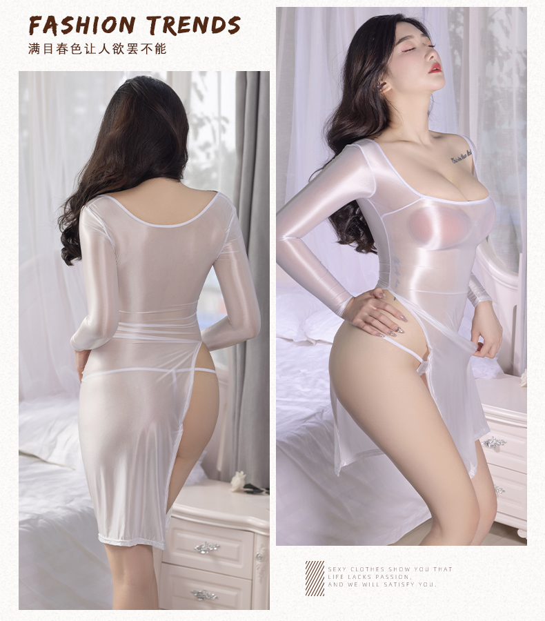 送丁字裤 性感长袖大领口开叉连身裙透视油光甜美辣妹一字肩遮P裙